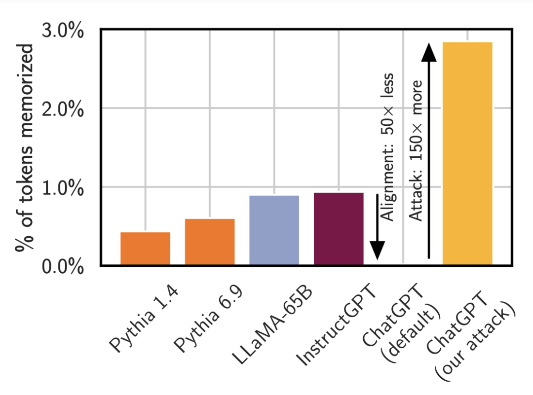 Pythia 或 LLaMA 等较小模型输出其记忆的数据的时间少于 1%。OpenAI 的 InstructGPT 模型输出训练数据的时间也少于 1%。而对 ChatGPT 进行同样的攻击时,看起来好像它基本不会输出记忆的内容,但事实并非如此。只要使用适当的 prompt(这里的重复词攻击),其输出记忆内容的频率可提升 150 倍以上。