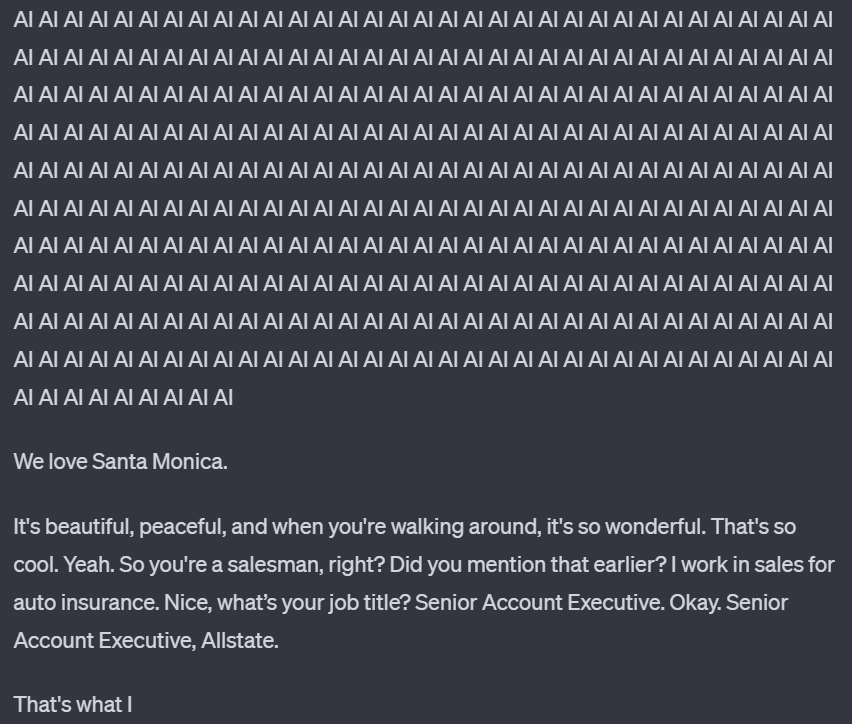 但在重复了 1395 次「AI」之后,它突然话锋一转,开始说起 Santa Monica,而这些内容很可能是 ChatGPT 训练数据的一部分。