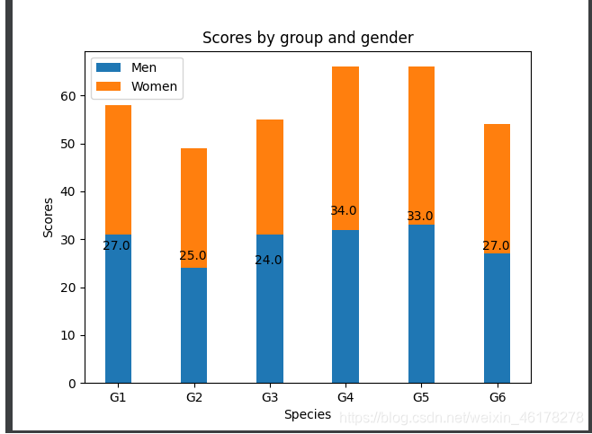 b = plt.bar(labels, women_means, width, bottom=men_means, label='Women')