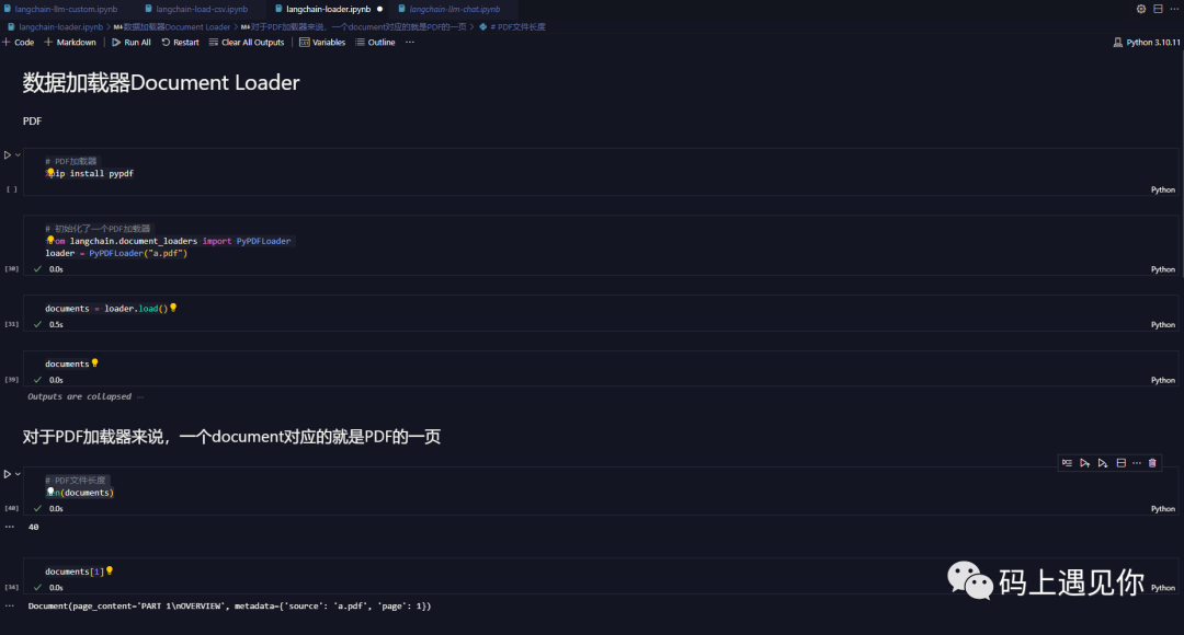 数据加载器(文档加载器):如图所示:一个PDF实际上就是对应一个数据源,然后经过文档加载器(这里使用的是对应的PDF加载器),当你吧PDF文档放到PDF加载器之后,它就会得到一系列我们称之为documents的东西。默认情况下PDF加载器会把PDF的每一页对应到一个document。如图所示,看到一共有6个document,也就意味这原始的PDF有6页。