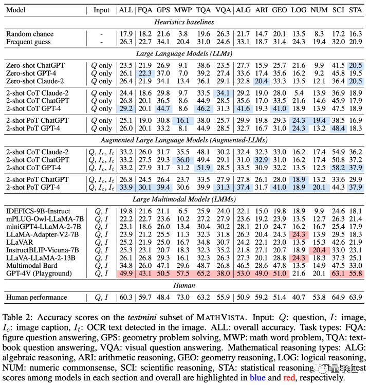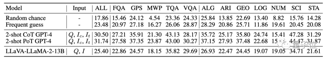 实验在testmini子集上评估了12种大模型:包括ChatGPT、GPT-4和Claude-2三个大语言模型,以及LLaVA、LLaMA-Adapter、miniGPT-4、Bard和GPT-4V等九种多模态大模型。