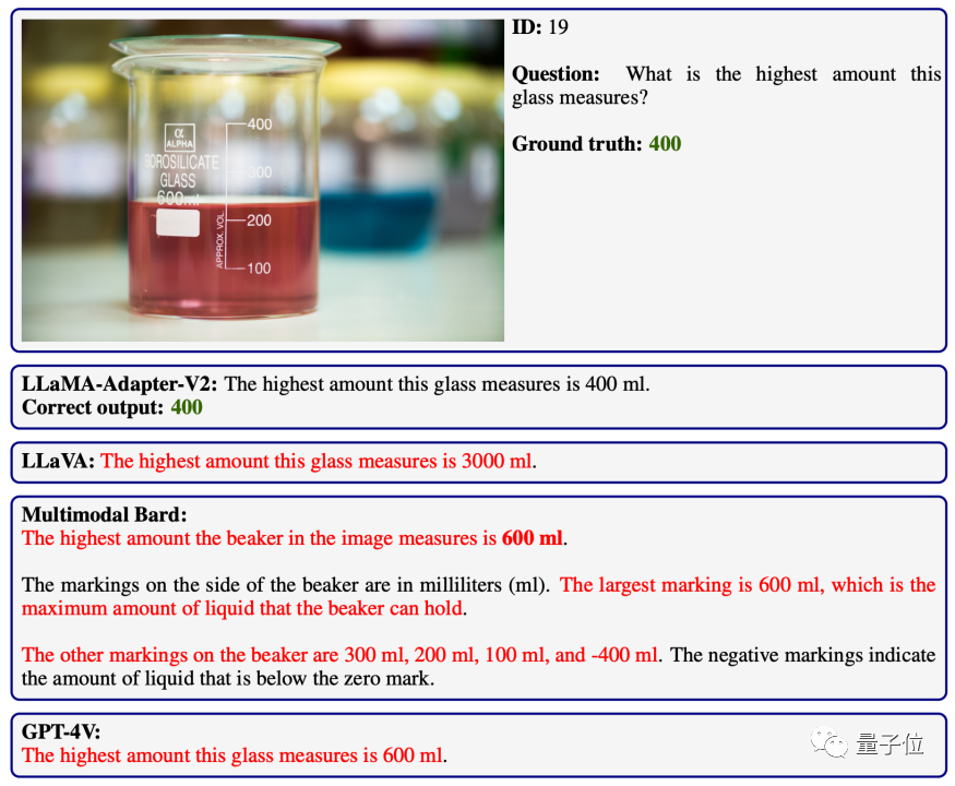 然而,某些情况下,例如识别烧杯的最大容量,GPT-4V与Bard模型均表现不佳。