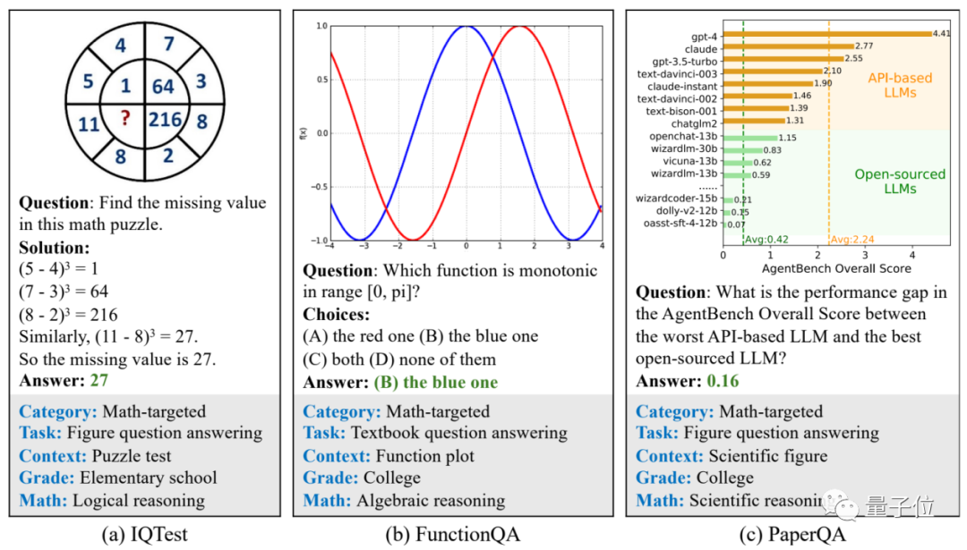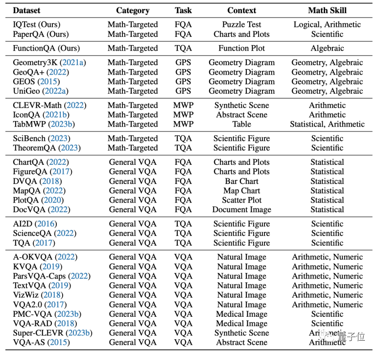 其中三个新标注的数据集是IQTest、FunctionQA和PaperQA,各有特色。