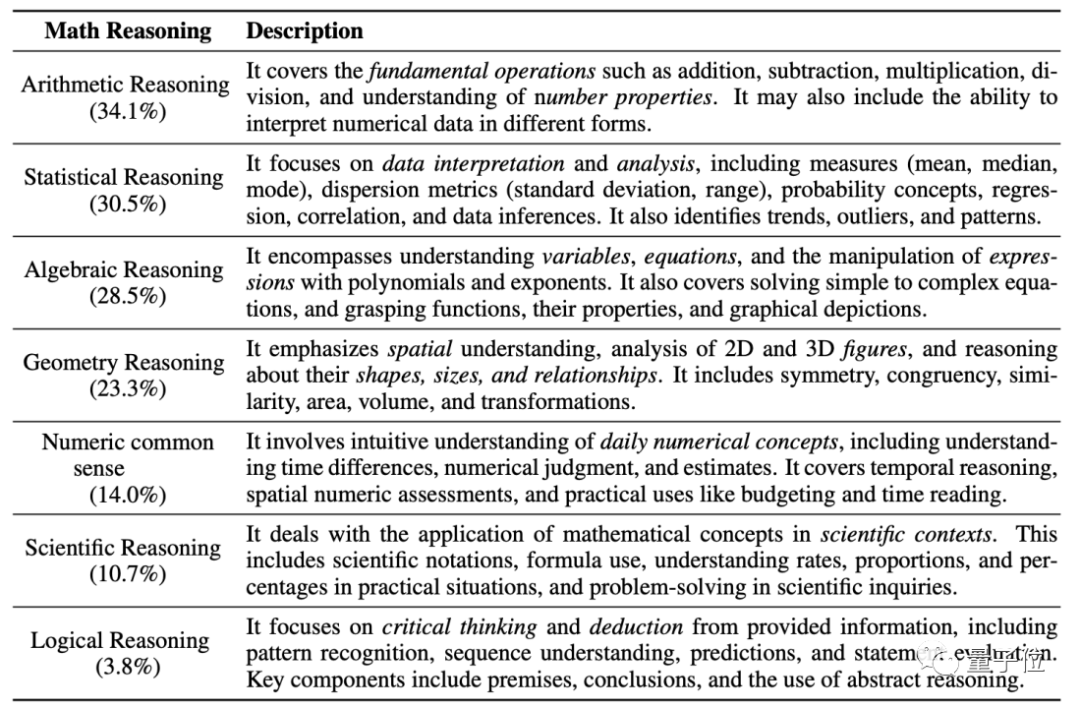 细分来看,MathVista定义了数学推理的七大能力领域,包括算术、统计、代数、几何、数值常识、科学和逻辑。