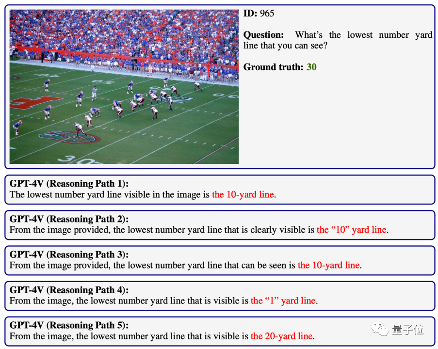 然而,实验也揭示了自洽性的局限性。特别是在GPT-4V难以正确理解复杂的视觉场景的情况下,自洽性的改善效果并不显著。