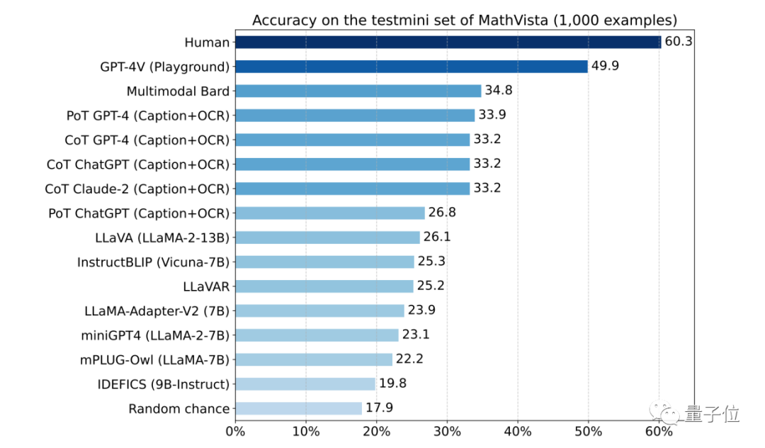 表现最佳的GPT-4V模型达到了49.9%的准确率,但这与人类的60.3%表现相比还有显著差距。
