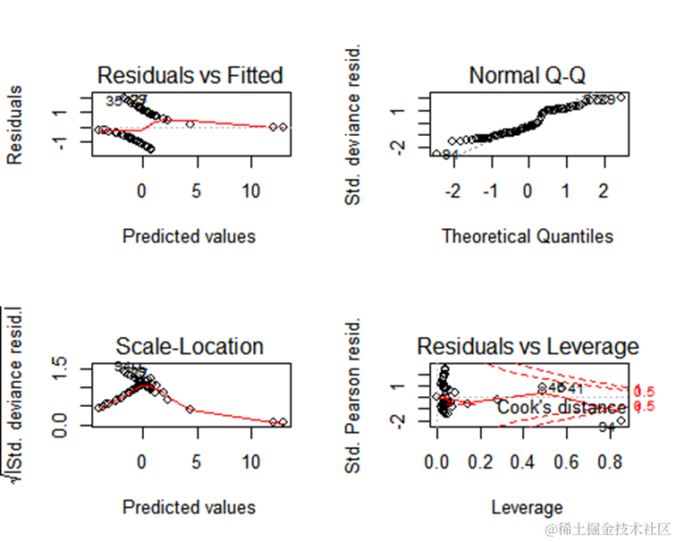 残差分析可以对回归模型的假设条件即随机误差项是否独立同分布进行检验,同时还可以找出离群点。命令语句为plot(lm.1),显示结果如下
