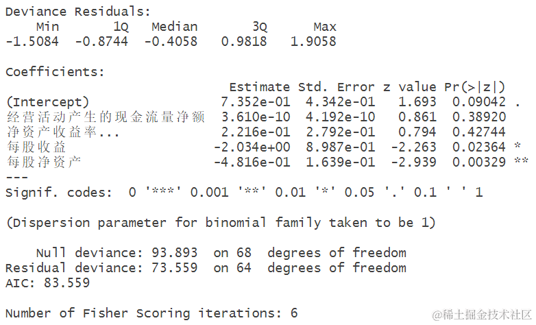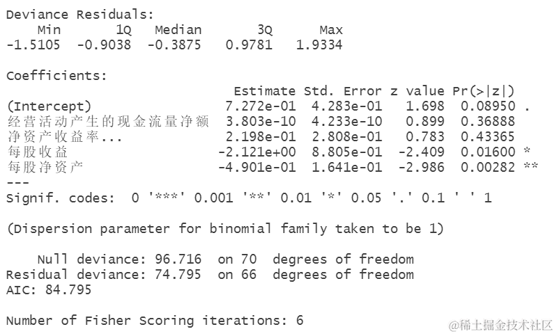 从输出结果可以看出 ,回归方程为ST= 1.285e+ 1.532e-10经营活动产生的现金流量净额 +3.023e-01 净资产收益率-2.078e+00每股收益-4.586e-01 股净资产 ,变量和的统计量的估计值分别为1.285e+00、1.532e-10、3.023e-01、-2.078e+00和-4.586e-01 ,每股收益和每股净资产对应的值都比显著性水平0.05小,可得2个偏回归系p数在显著性水平0.05下均显著不为零。因此,可以认为每股收益 、每股净资产 具有显著的影响。进一步地剩余方差的估计值,deviance统计量的估计值为96.716 ,说明,回归方程效果较好。