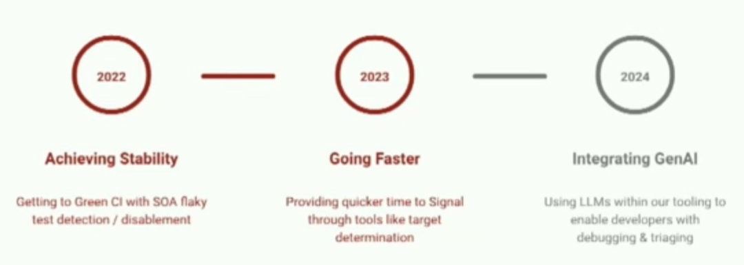 我们希望确保我们能够整合一些关于测试不稳定性检测和禁用的内容,以确保我们的开发人员获得最可靠的持续集成(CI)。今年,我们的主要关注点是变得更快。我们如何通过目标确定、测试重排等方式提供更快的响应时间?我们使用很多启发式方法来确定要运行的测试。