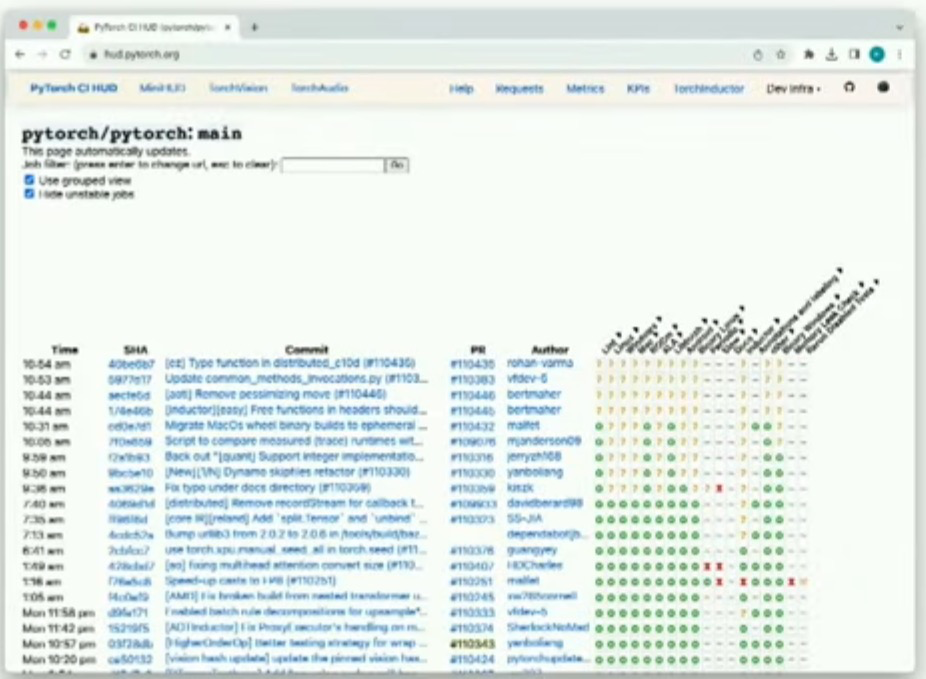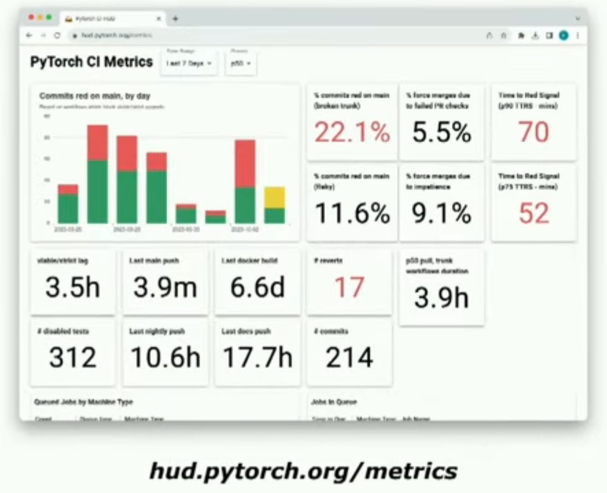 我们的codebase,你们也可以自己写代码,同样可以这样做。hud.pytorch.org是我们的旗舰工具。这是大多数开发人员与此信号进行交互的工具。通常来说,历史上它被用作一种当出现故障时可以查看的报警工具。