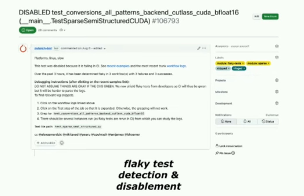 另一个重要变化是PyTorch bot merge。如果您曾经为PyTorch做出过贡献,我相信您一定见过这个。在历史背景下,PyTorch组织的工作方式是,您提交了一个PR,这个PR会合并到Facebook的monorepo中,然后再发布到github。但现在我们可以直接在github上合并,这是一个很好的创新。其中一个更好的方面是,我们实际上实现了一些GitHub还没有引入的特性,如merge on green。此外,我们还可以选择性地禁用或忽略一些不稳定的测试,这将是我接下来要谈论的内容。片状测试 Flaky Tests检测与禁用。在过去的一年中,我们做了一些非常棒的工作,特别关注这个系统。