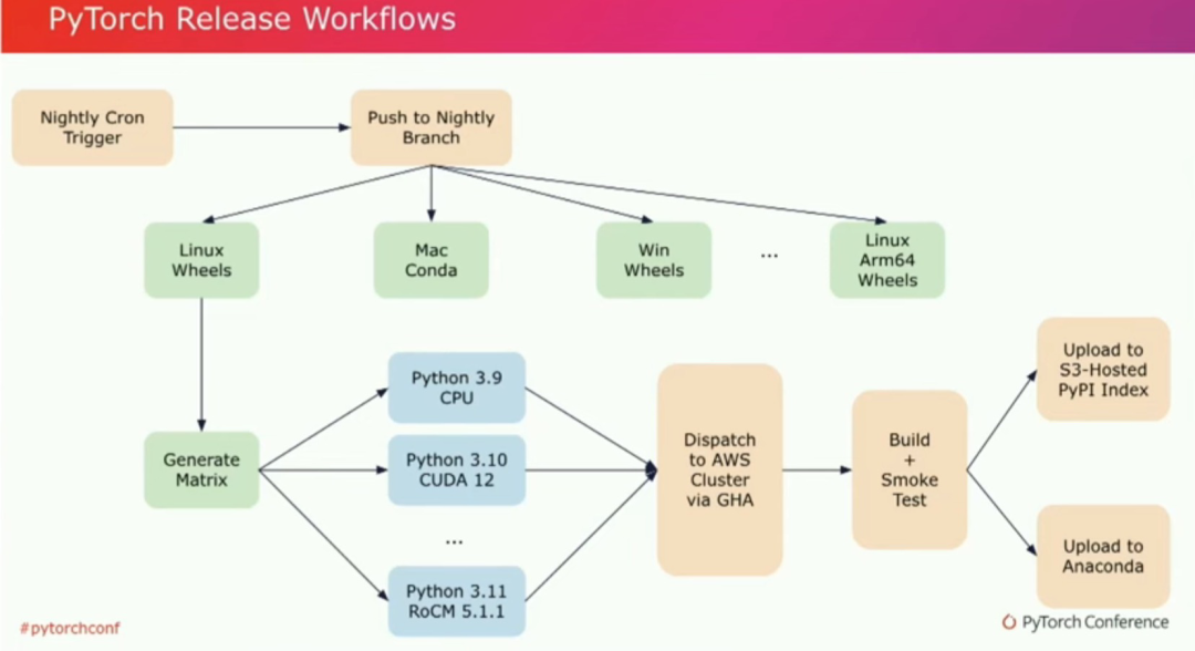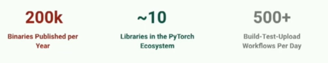 每天晚上,我们大约有500个构建、测试和上传工作流在运行,这个数字非常庞大,因为我们要支持跨不同Python版本、不同CUDA版本、Rockham用于AMD GPU支持、不同操作系统和CPU架构等各种矩阵的构建。我们并不仅仅发布PyTorch,而是发布整个生态系统,其中还包括约10个其他生态系统项目。因此,按照整年来的推算,我们发布大约20万个二进制文件。之前我们做这个时,逻辑分散在不同的生态系统库中,我们在平台方面也没有任何标准化措施。