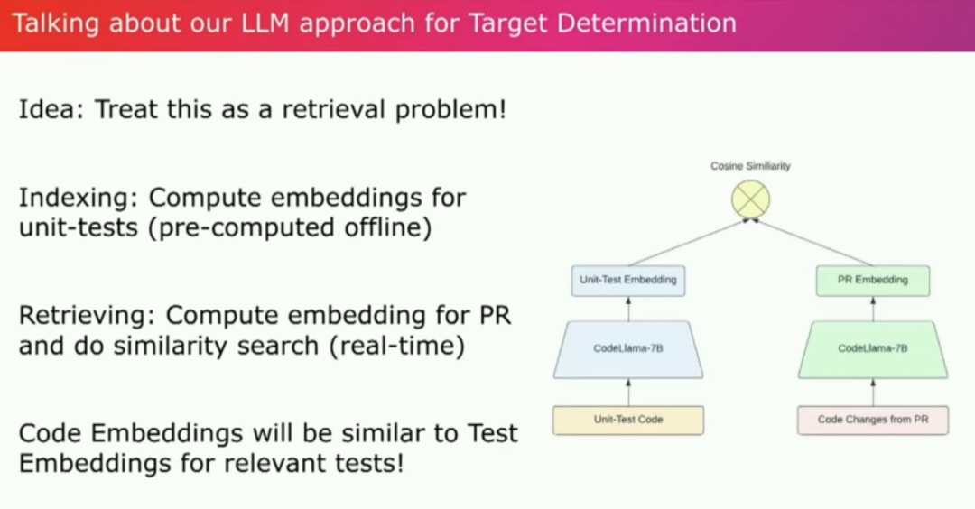 因此,目标不仅是改善PyTorch开发者的体验,但也是找到改进pytorch及其相关代码库的机会。我们也看到LLM是整个系统的一部分。但不一定是整个答案。它们可以与像过去的失败这样的启发式方法相结合。有一些研究关于使用测试相关性的内容,可以确定哪些测试经常一起通过或一起失败,这可以与我们从LLM驱动的方法得到的分数相结合。