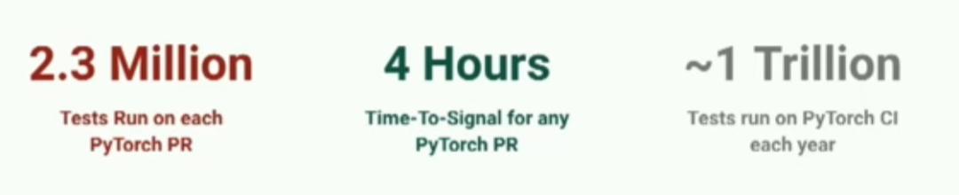 还有三个对于开发者基础设施非常重要且我想重点关注的方面。OSS CI Infra基本上是所有CI作业运行的地方。这是一个大约有3500台机器的集群,每天都会达到最高峰,测试每一个进入PyTorch的代码更改。