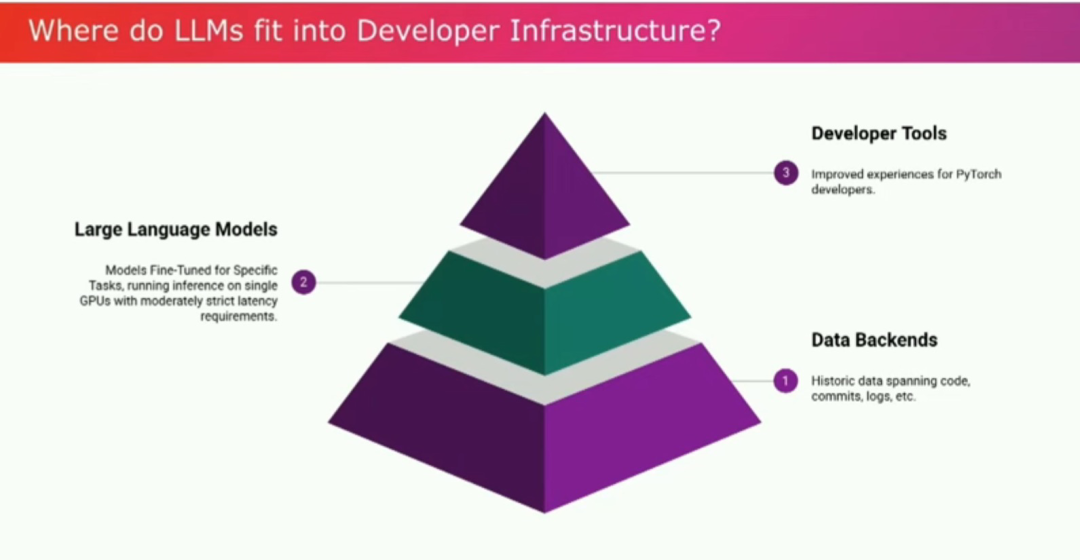 在会议的其余部分,你将了解到PyTorch正在推动许多创新。我们正在思考如何闭环运用LLMs来改进PyTorch,特别是PyTorch的开发体验。我们有很多有趣的数据需要依赖,包括日志、元数据等等。有很多模型,比如Code Llama,在代码上表现出色,经过代码微调后,在代码补全和多行填充等方面也非常好。它们相对较小,因此可以在单个GPU上进行推导,并满足严格的延迟要求。