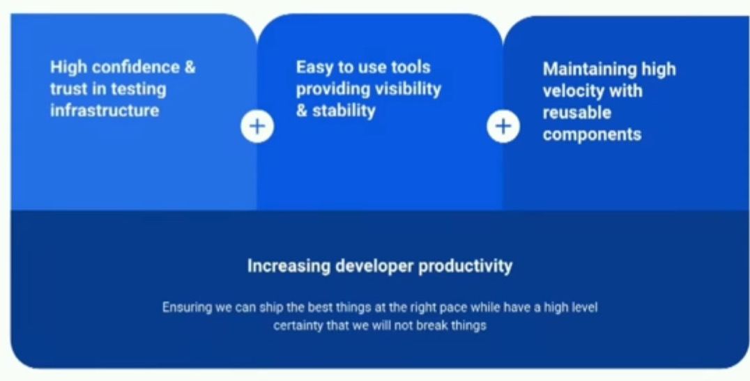 我们发现,当人们对我们的测试基础设施有这种信任和信心时,他们通常能够更快地提交PR。同时,我们希望提供易于使用的工具,提供可见性和稳定性。明白吗,你可以看到你的signal,通常可以得到更好的结果。归根结底,我们还希望以可重用的组件保持高速度。所以,如果你有一个可以在许多不同地方重用的组件,可能是通用的,我们也希望能够做到这一点。最重要的是,所有这些都有助于提高开发人员的生产力。因此,确保我们能够以高度的信心保持高速度。