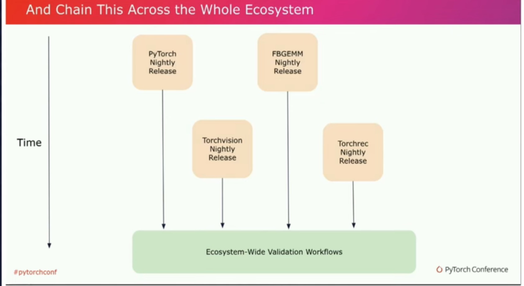所有这全部是针对一个存储库的,我们必须在PyTorch生态系统的每个仓库中进行这些操作。我们还需要以依赖感知的方式来进行这些操作。例如,针对某一天的torch vision夜间版本将依赖于PyTorch夜间版本。因此,我们需要确保在开始进行torch vision构建之前,已经构建、测试和上传了nightly版本。因此,所有这些构建都是以依赖感知的方式交错进行的。一旦它们都被构建、测试和上传,我们会将它们获取到生态系统范围的验证工作流中,运行元数据检查并确保所有这些二进制文件能够正常工作。