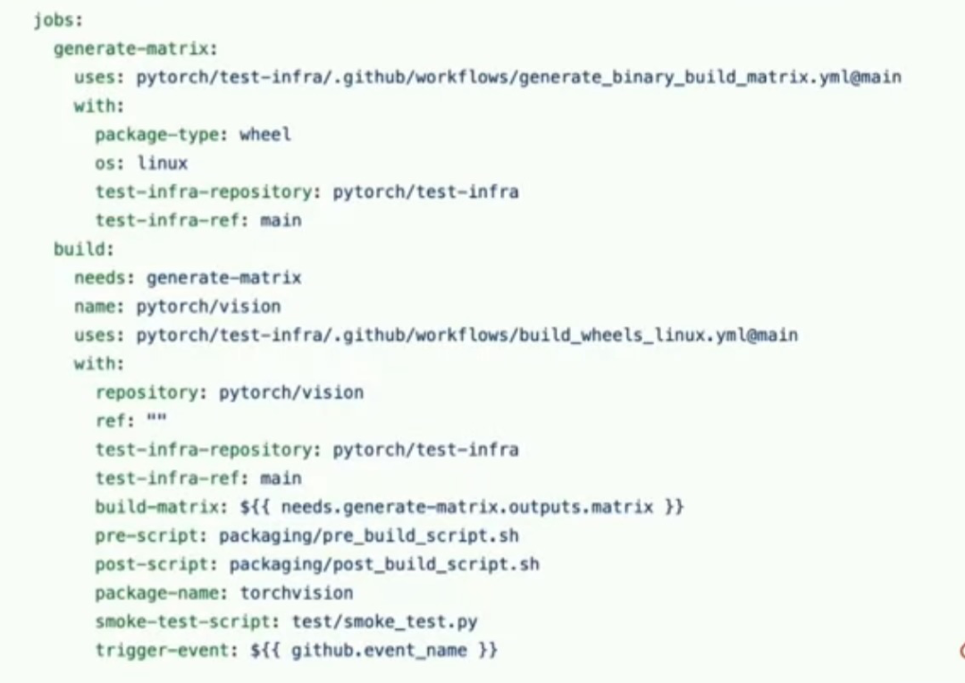 这样做的动机是让PyTorch生态系统中的任何现有或新项目,在大约20行代码中即可开始使用CI/CD,就像这里的工作流一样。因此,这对您来说有什么作用呢?它使您可以选择您想要构建的特定平台。它为您设置了一个干净的构建环境,以及其他类型的二进制文件。它支持自定义预构建或后构建步骤的钩子,以及您可能希望运行的任何任意烟雾测试以验证二进制的有效性。然后将其上传到所选的渠道。通过这种方式,任何库都可以相对快速地开始使用其CI/CD,与整个PyTorch生态系统保持一致,并且基本上具有无需操作的过程,用于运行其夜间发布和正式发布。这只是一个新项目所有者的界面提示。但实际上是怎么运作的?