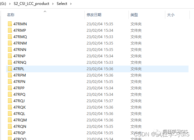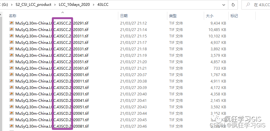 同时,在每一个遥感影像文件的文件名中,都有分幅条带号这一字段;例如,打开43LCC这一子文件夹,如下图所示。