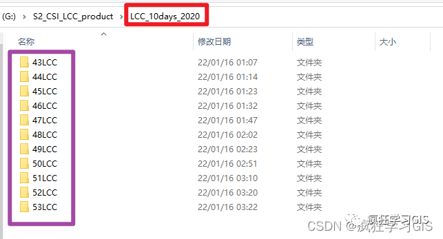 其中,红色框内的文件夹即为前述“大文件夹”,紫色框内的每一个文件夹即为前述“子文件夹”。此外,每一个子文件夹的命名也是和遥感影像的分幅条带号对应的,比如43LCC这一个子文件夹就是保存了UTM编号为43的网格内的全部遥感影像。这里关于Sentinel-2遥感影像分幅条带号的介绍,如果大家有需要,可以参考哨兵2号条带号介绍与MGRS矢量文件获取这篇文章。