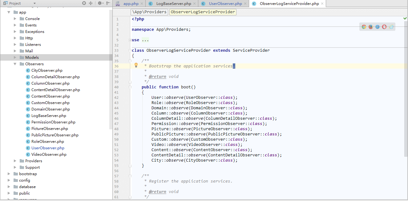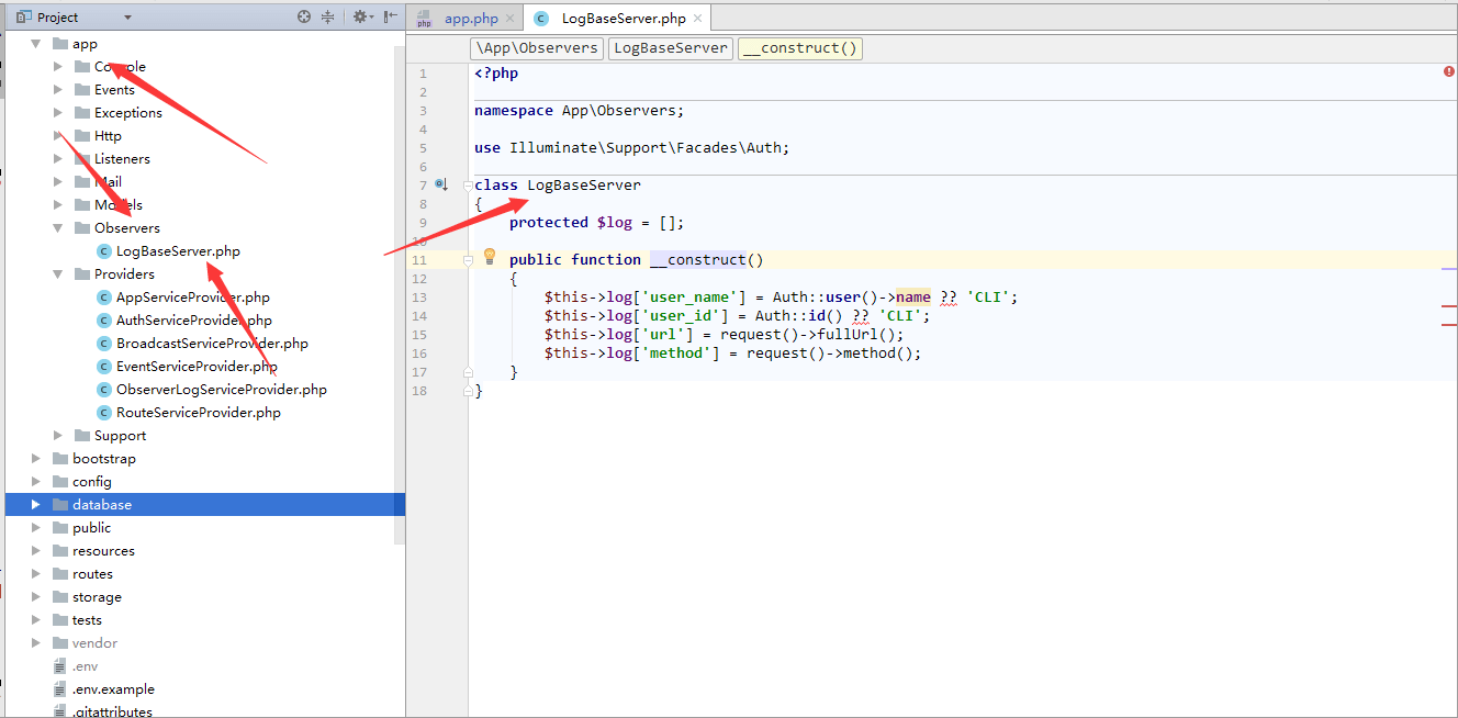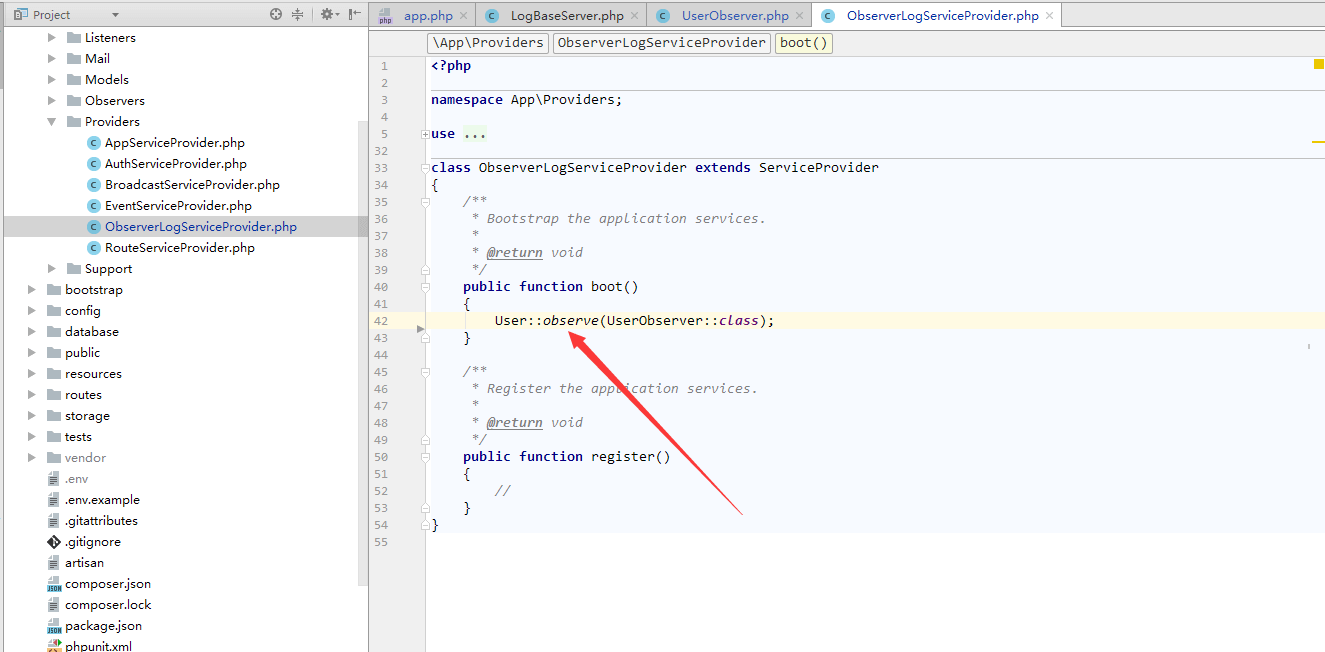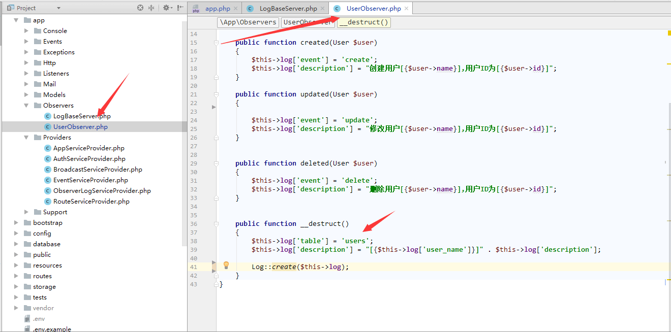 }php artisan migratephp artisan make:provider ObserverLogServiceProvider/config/app.php中的providers数组注册(大概如图中)