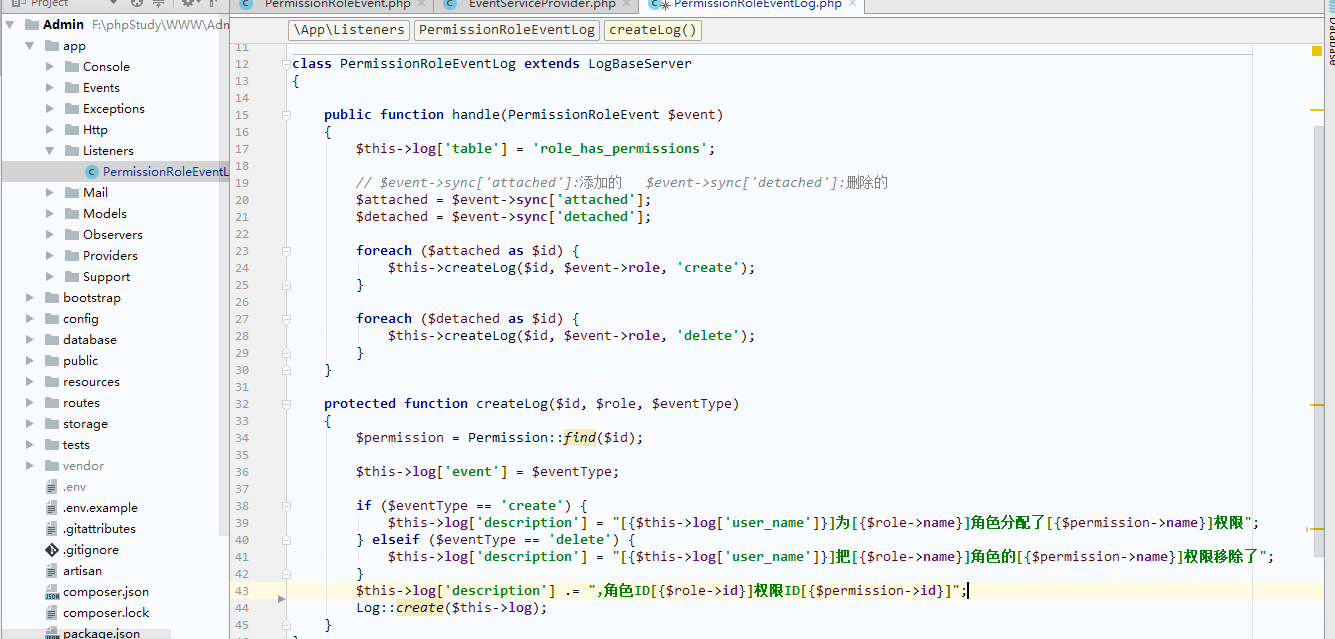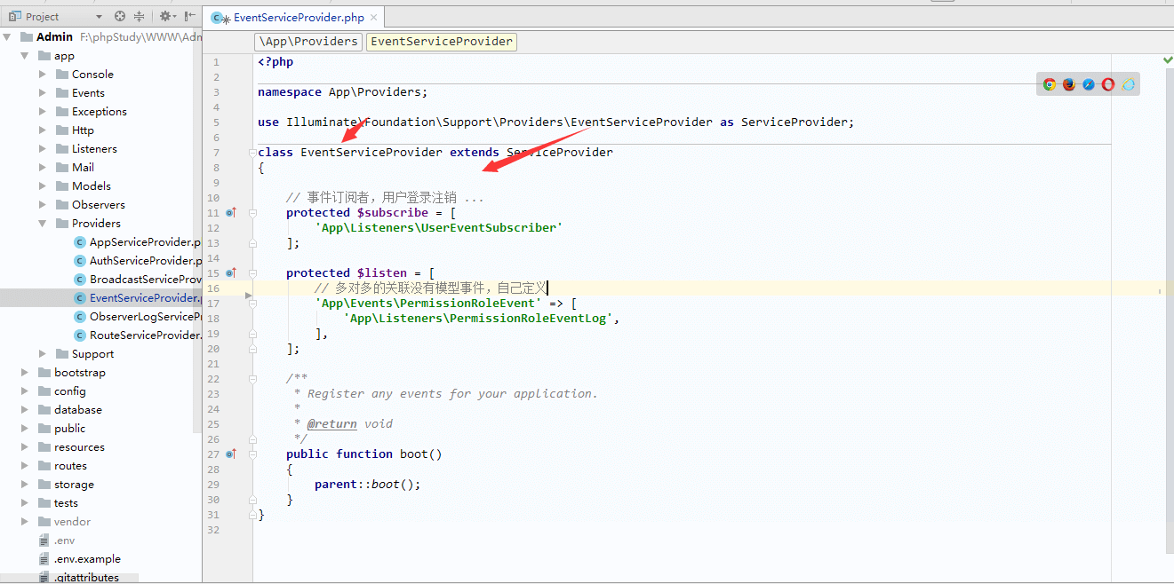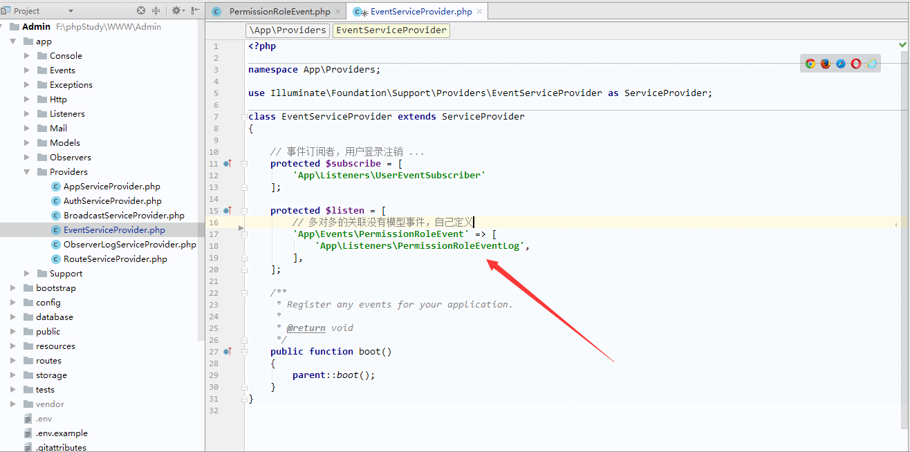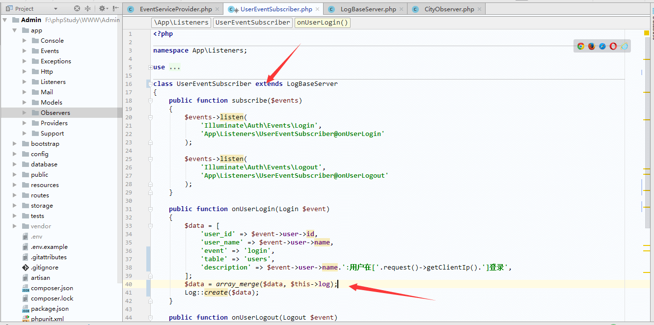 }php artisan migratephp artisan make:provider ObserverLogServiceProvider/config/app.php中的providers数组注册(大概如图中)