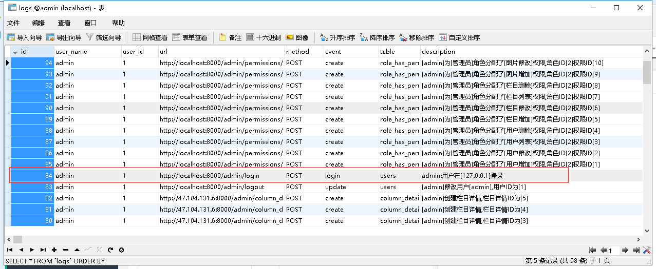 $table->string('event')->comment('当前操作的事件,create,update,delete');