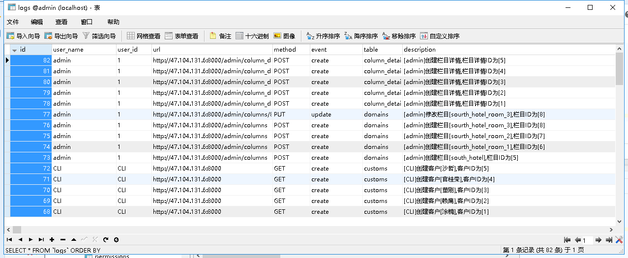 $table->string('table')->comment('操作的表');