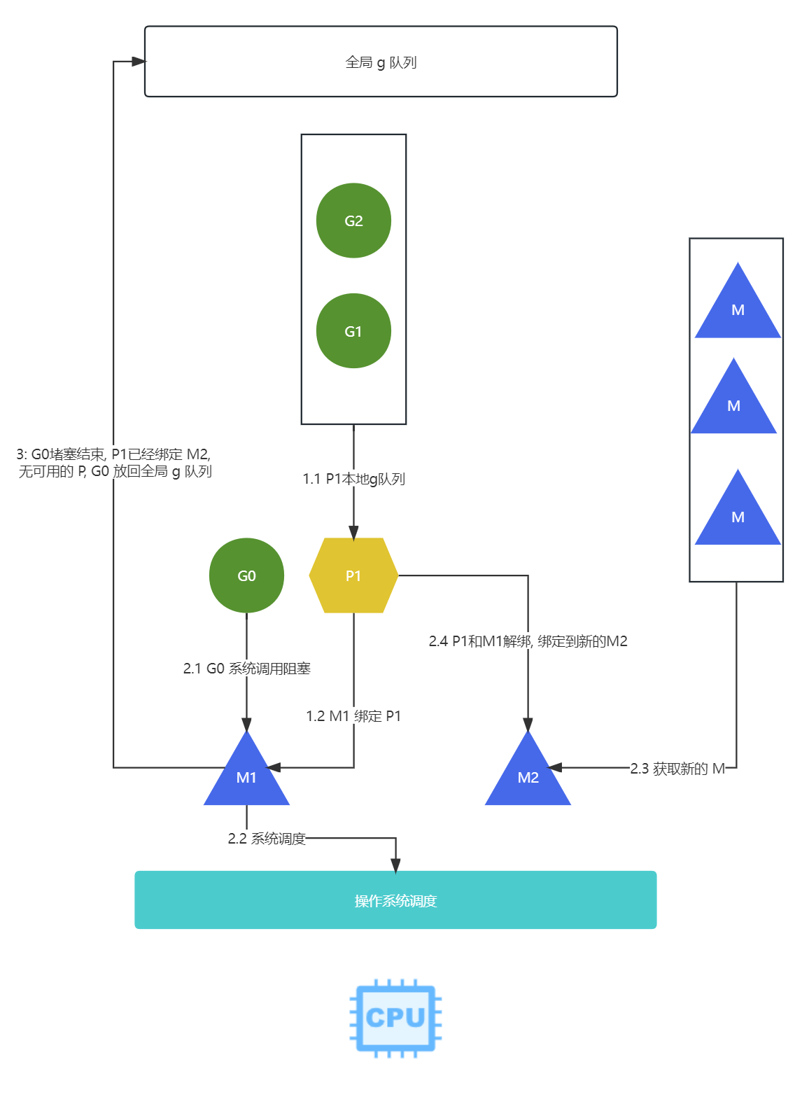 GOMAXPROCS等于1的时候, 什么时候会出现线程切换? 是不是无法高并发呢?1个任务, 但是cpu实在是太快了. 并且网络io(大部分web服务都是属于网络io)不占用cpu时间G-P-M调度模型, GOMAXPROCS等于1, P指为P1运行(假设P1里的本地队列有G0,G1,G2三个goroutine),M1绑定到P1上G0里遇到以下场景 io阻塞的时候P绑定的M1线程去交给系统调度,M2P1, 继续调度P1后面的G1,G2M1的阻塞调用结束后, 会优先返回P1, 但是P1已经被M2占用, 然后从空闲队列P获取,但是我们只有一个P,也获取失败, 就会把G0放到全局队列中, 等待P1之后获取