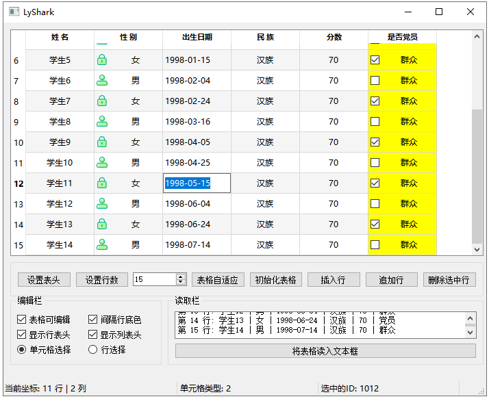 ui->tableWidget->clearContents() 清除工作区中的内容,但不清除表格结构。QString::asprintf 格式化字符串设置学生姓名。createItemsARow 方法为某一行创建各个单元格的 QTableWidgetItem。isParty 表示学生是否为党员,每次取反。通过这样的初始化,表格会被填充上预设的学生数据,每一行包含姓名、性别、出生日期、民族、是否党员和分数等信息。