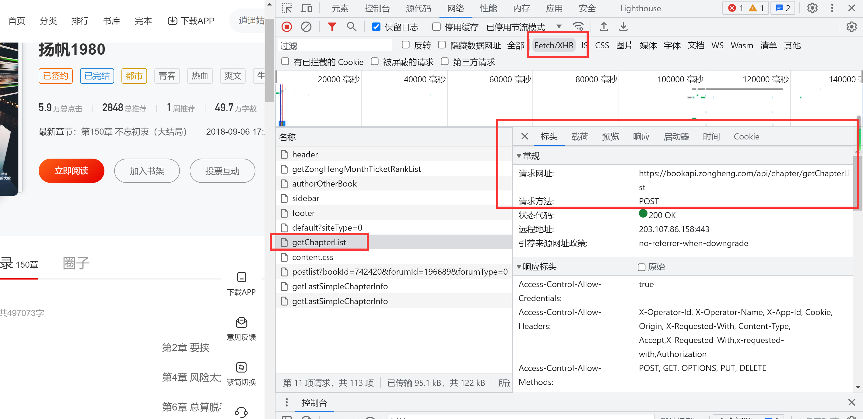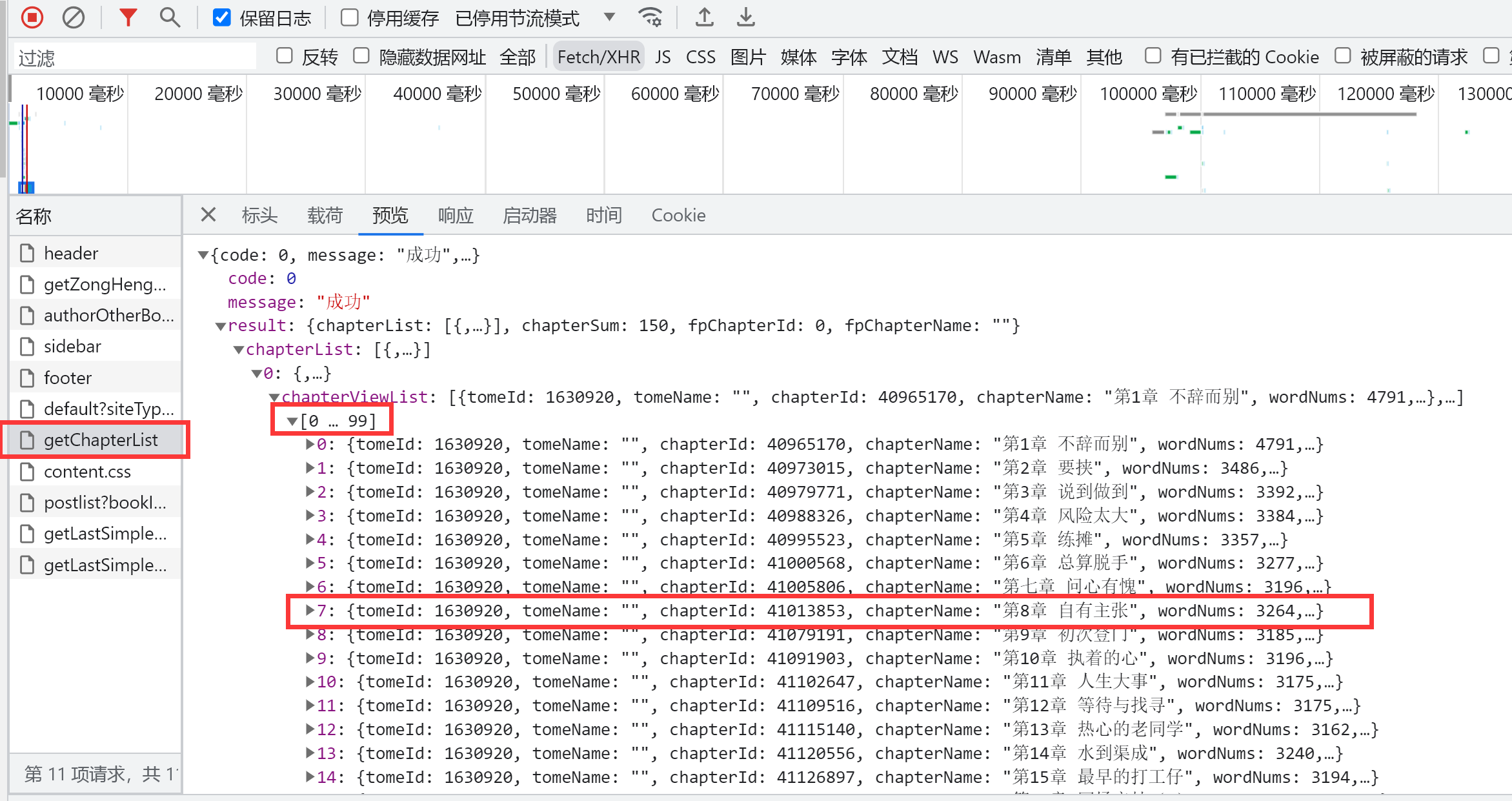 我们打开网络,先找到目录,大战getChapterList可以获取所有的连接地址。