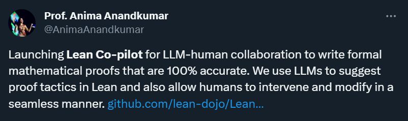 值得注意的是,LeanDojo 团队的研究主要集中在使用 LLM 自动化定理证明方面,从这点也不难看出,他们推出的 Lean Copilot 和 LLM 相关也不会令人吃惊。