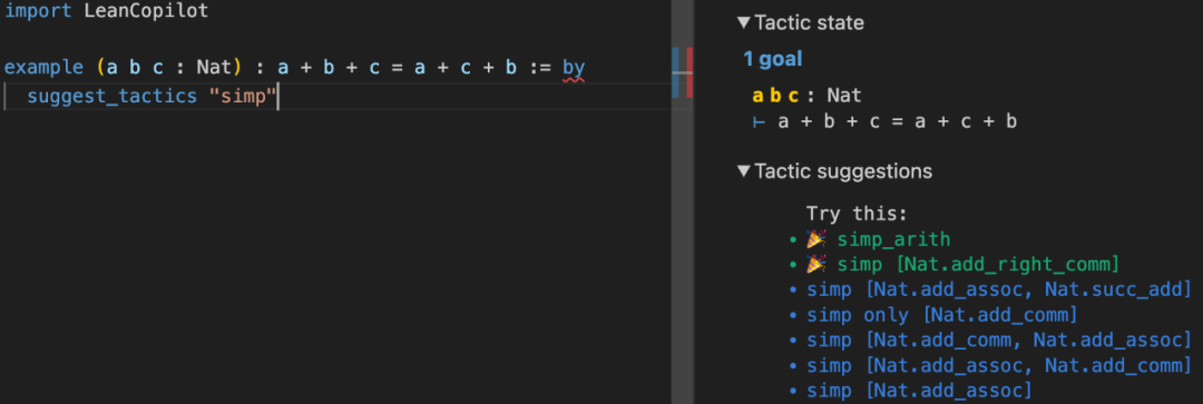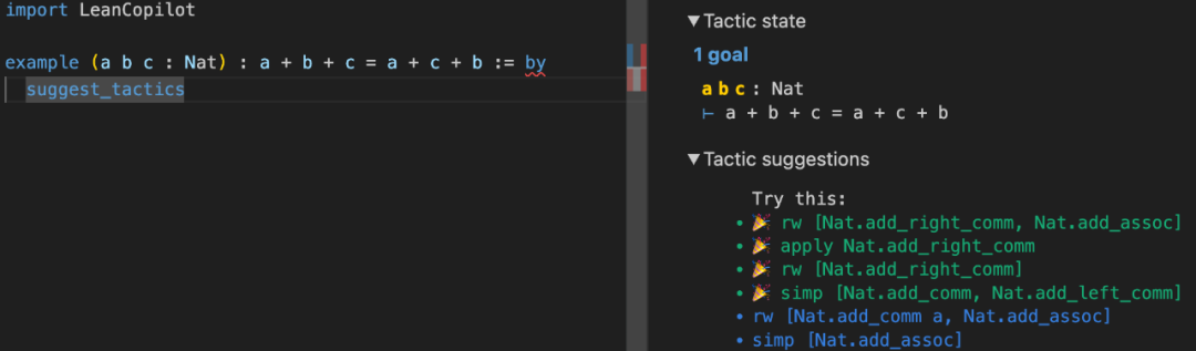 策略建议。导入 LeanCopilot 后,你可以使用 suggest_tactics 生成策略建议。使用过程中,你也可以点击建议的策略,并在证明中使用它(参考下图)。