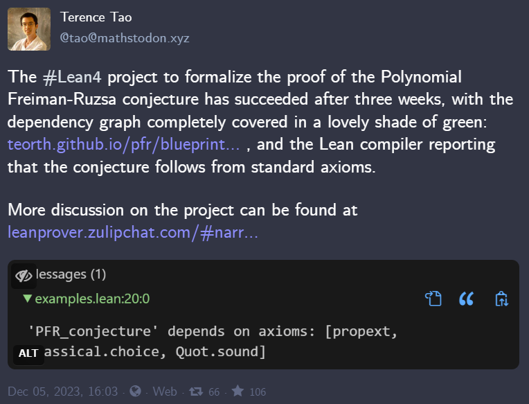 不仅如此,前几天,陶哲轩表示:对多项式 Freiman-Ruzsa 猜想(PFR)的证明进行形式化的 Lean4 项目成功完成,并且耗时仅三周时间。Lean 编译器也报告该猜想符合标准公理,可以说这是计算机和 AI 辅助证明的一项巨大成功。