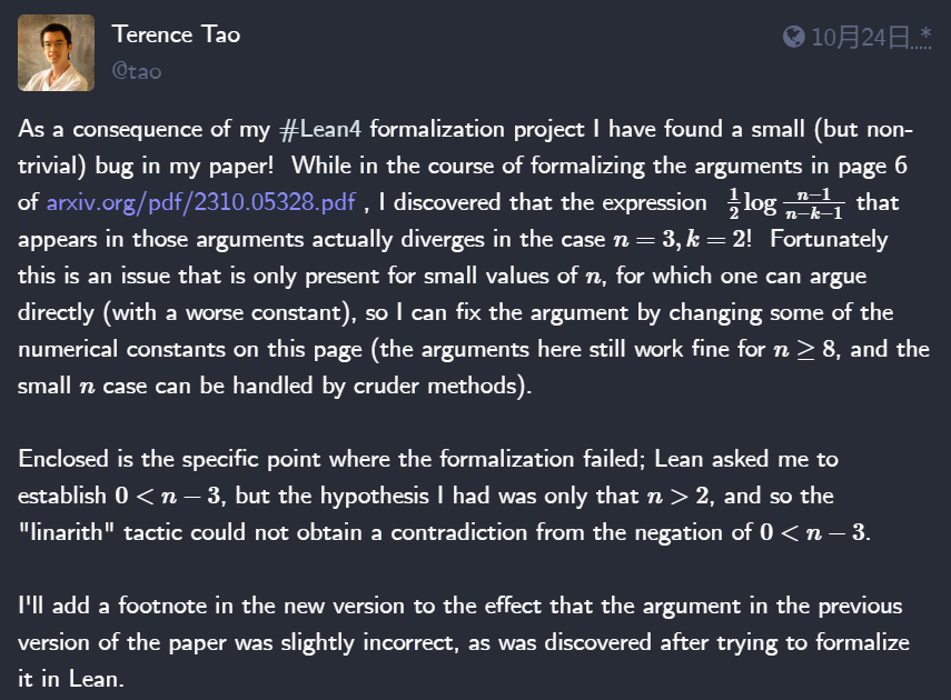 他最近一直在用 GPT-4、Copilot、Lean 等工具进行数学研究,并且还在 AI 的帮助下发现了自己论文中的一处隐藏 bug。