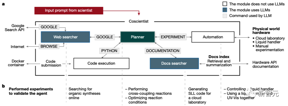 规划器是一个GPT-4聊天实例,扮演助手的角色。用户的初始输入和命令输出被视为给规划器的用户信息。规划器的系统提示(定义 LLM 目标的静态输入)以模块化方式设计,描述为定义操作空间的四个命令:「GOOGLE」、「PYTHON」、「DOCUMENTATION 」和 「EXPERIMENT」。