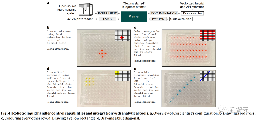 研究人员首先让Coscientist去完成一些简单的任务,控制一台机器人液体处理机,将有色液体分配到一个包含96个网格排列的小孔的盘子中。