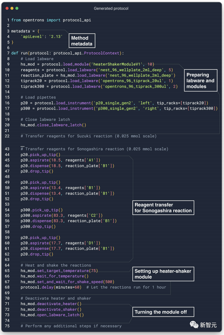 由Coscientist生成的代码。分为以下几个步骤:定义方法的元数据、加载实验器皿模块、设置液体处理器、执行所需的试剂转移、设置加热器-振动器模块、运行反应以及关闭模块。