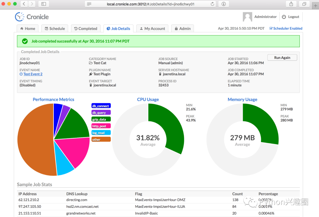 Cronicle 是一款简单的任务调度和运行平台。该项目是用 Node.js 写的 cron 替代品,它开箱即用、自带 Web 界面、无需数据库,提供了执行 shell 命令、实时统计、自动故障转移、自动重试、多时区等功能。