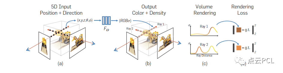 图2:优化神经辐射场只需计算使用体积渲染计算的重建图像与保留视图之间的简单损失或误差。中介参数由一个多层感知器(MLP)确定,该MLP以5D坐标为输入,并输出依赖于视图的辐射发射率(RGB)和体积密度(σ)。
