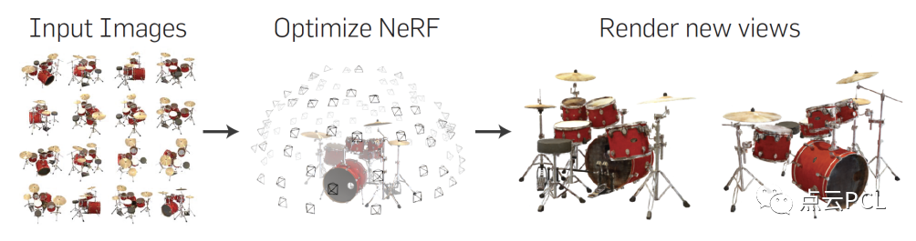 图1:经典的多视图合成问题。给定一组输入图像(这里是在周围半球上随机捕获的合成的架子鼓场景的100个视图),我们首先优化了一个NeRF表示,然后使用它进行体积渲染,合成两个新颖的视图,包括视角相关的镜面效果和反射。在过去的三十年里,视图合成或基于图像的渲染的探索一直是寻找3D场景的“最佳”中间表示方法,以实现最高质量的视图合成;这个图示通用地代表了该领域中许多先前的论文。