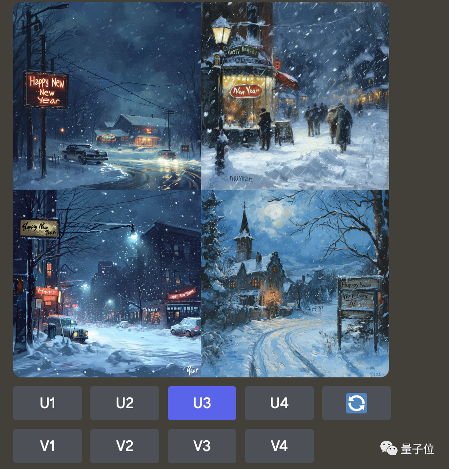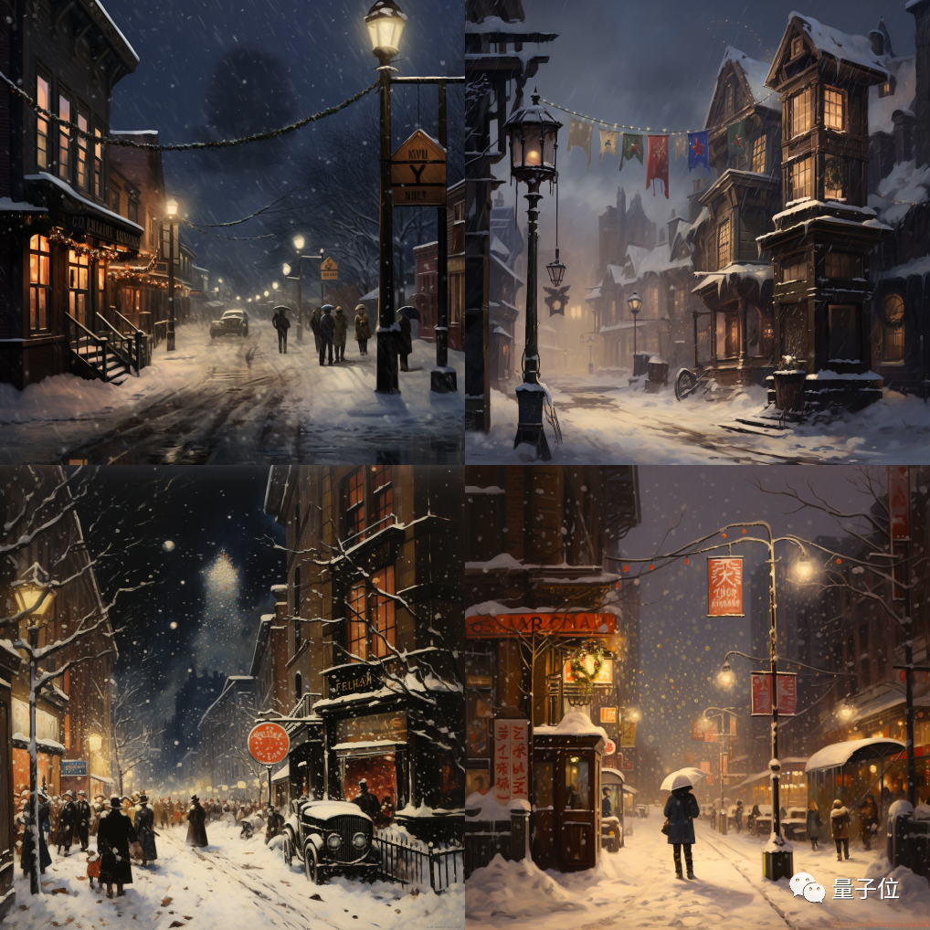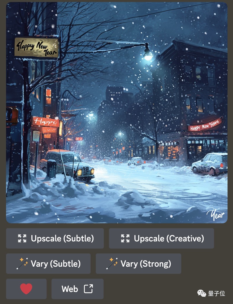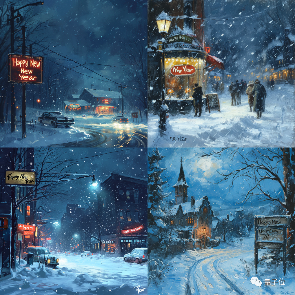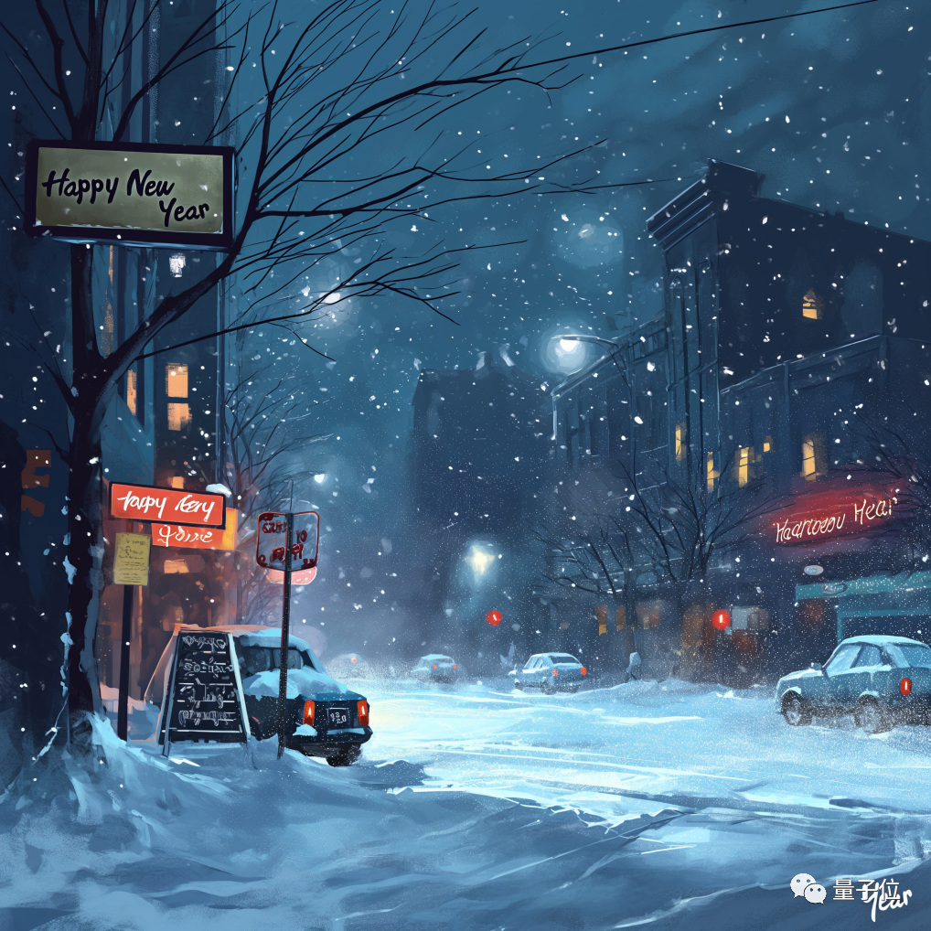 我们让Midjourney描绘一幅跨年夜的场景,要求要有漫天飞舞的大雪,还要有一个牌子上面写着“新年快乐”: