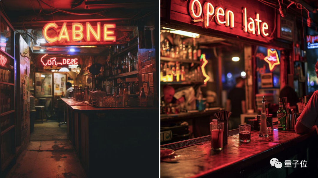让Midjourney V5.2(左)、V6(右)画一个酒吧,需要用灯牌标注”open late”(营业到很晚),V6画起来毫无难度: