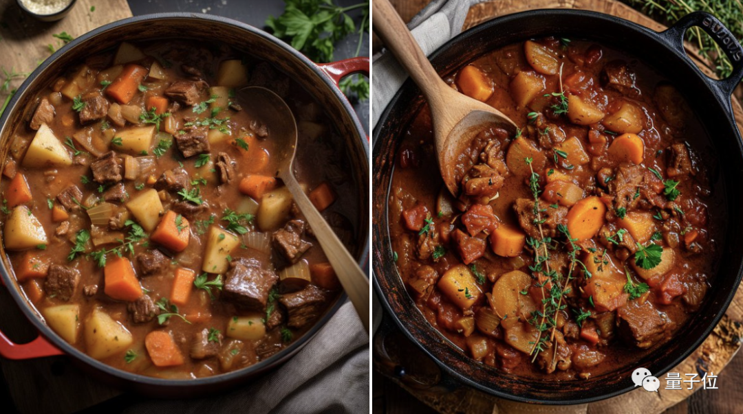 就说一道番茄炖牛腩,右边的图不仅菜看起来更自然、更有食欲,就连木勺的细节也没放过(左V5.2,右V6):