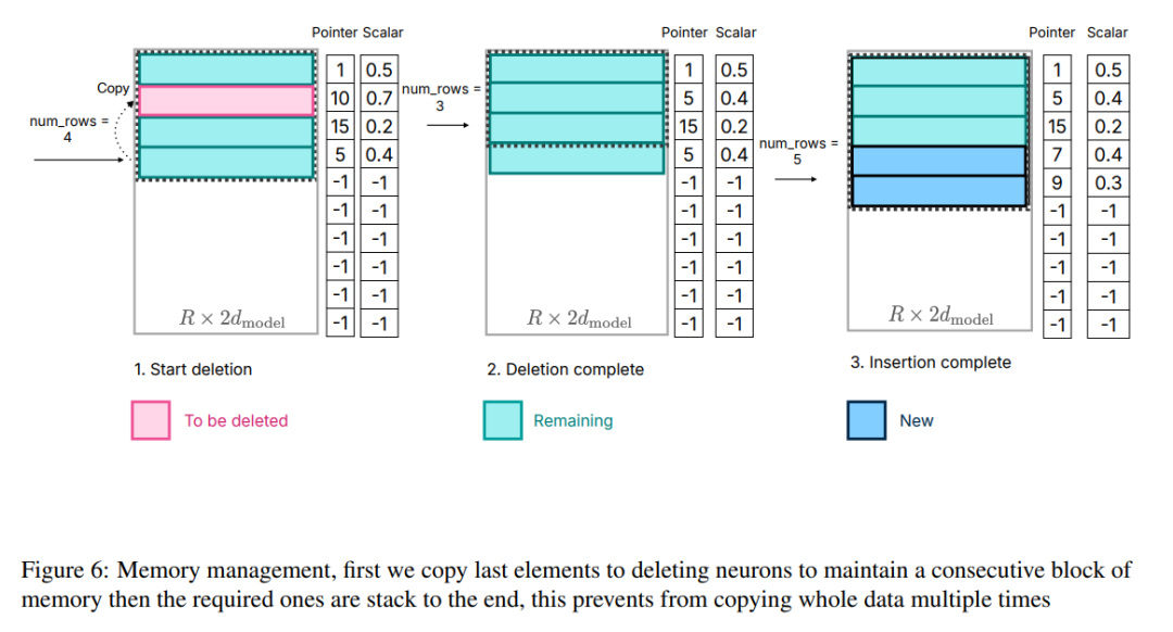 图 6:内存管理,首先将最后一个元素复制到删除神经元,以保持内存块的连续性,然后将所需元素堆栈到最后,这样可以避免多次复制整个数据。