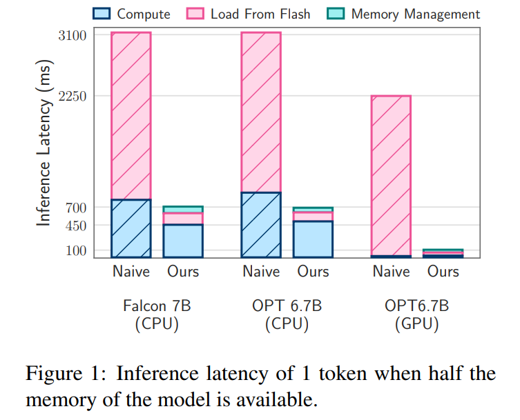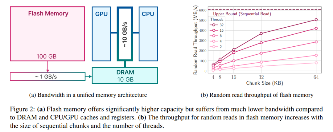 依赖 NAND 闪存的 naive 推理实现可能需要为每个前向传递重新加载整个模型,这一过程非常耗时,即使是压缩模型也需要几秒时间。此外将数据从 DRAM 传输到 CPU 或 GPU 内存需要耗费更多能量。