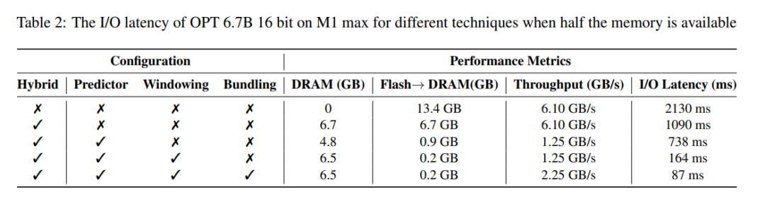 延迟分析。当窗口大小为 5 ,每个 token 需要访问 2.4% 的前馈网络(FFN)神经元。对于 32 位模型,每次读取的数据块大小为 2dmodel × 4 字节 = 32 KiB,因为它涉及行和列的连接。在 M1 Max 上,从闪存加载每个 token 的延迟为 125 毫秒,内存管理(包括神经元的删除和添加)的延迟为 65 毫秒。因此,与内存相关的总延迟不到每个 token 190 毫秒(参见图 1)。相比之下,基线方法需要以 6.1GB/s 的速度加载 13.4GB 的数据,导致每个 token 的延迟约为 2330 毫秒。因此,与基线方法相比,本文的方法有了很大改进。