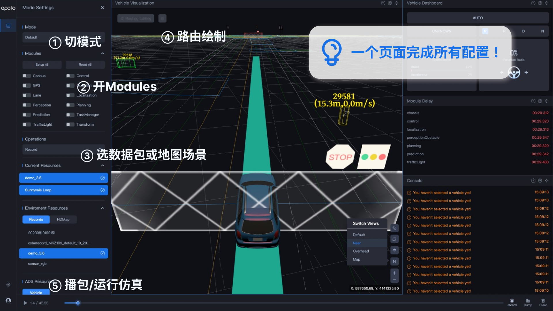 相对于旧版DV,全新Dreamview+在同一页面即可顺序完成PnC调试配置,减少配置步骤。
