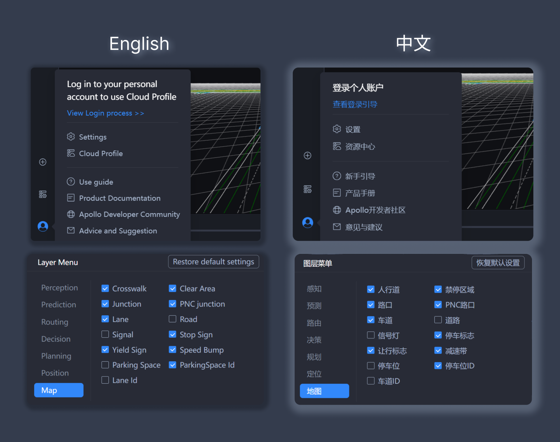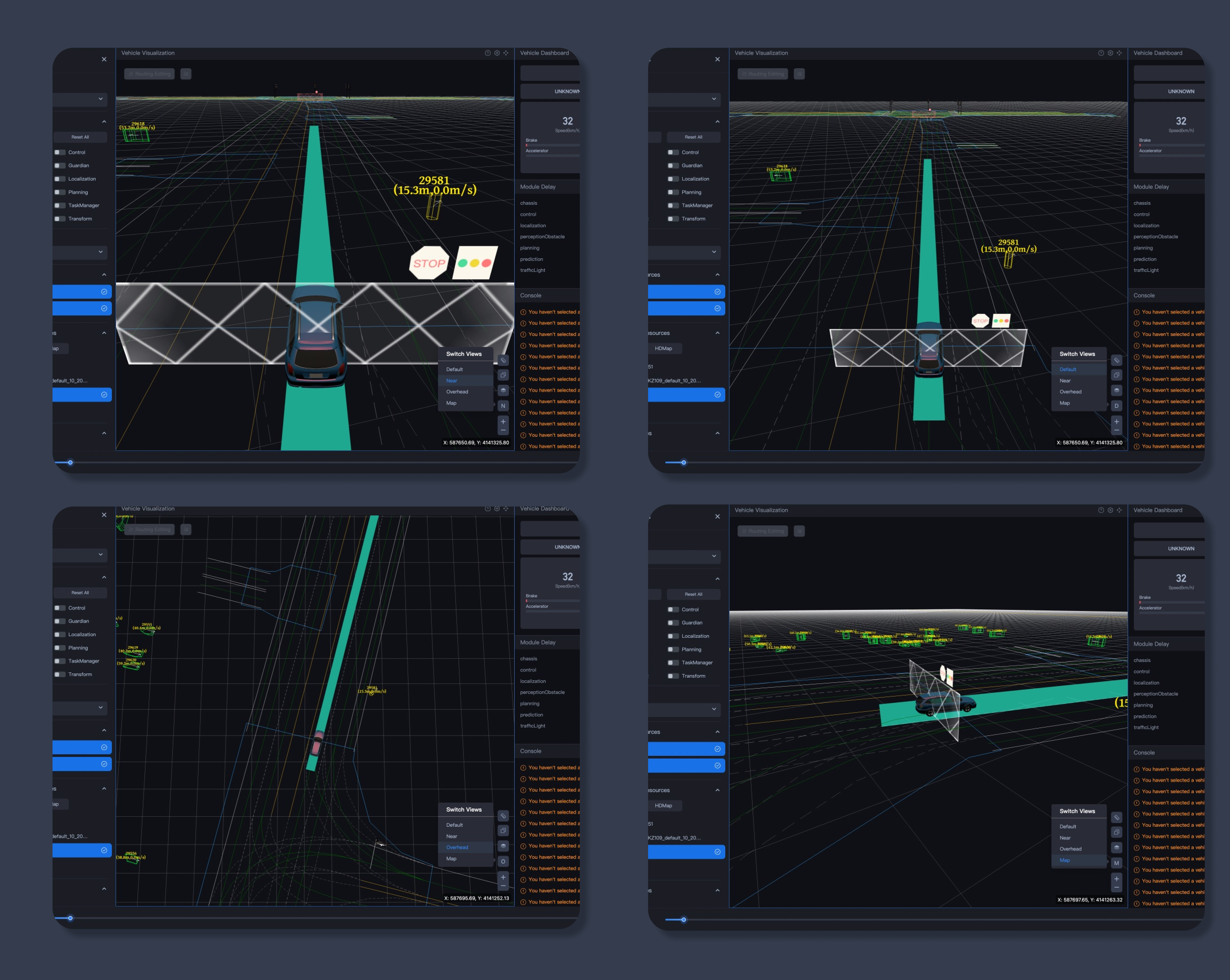 全新Dreamview+从感知、PnC等不同业务研发场景出发,根据不同场景的操作方式与开发流程,设计了默认模式、感知模式、PnC模式三种场景模式,开发者可以在三种模式之间随意切换,选择适应自身需求的模式进行自动驾驶开发,增强了场景针对性,同时极大提升了开发效率。