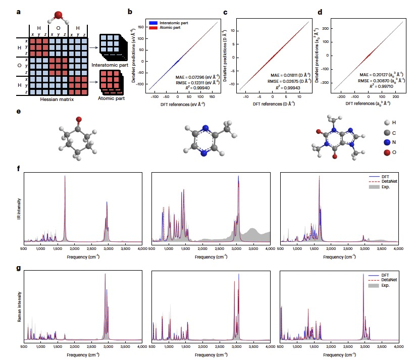预测分子的振动光谱:在这一部分研究中,作者将DetaNet的精确等变属性预测能力与谐振子近似相结合,开发了方法来预测分子的振动光谱。在深度学习中训练和预测Hessian矩阵是一项挑战,因为在现有框架中计算二阶交叉偏导数在计算上非常昂贵。尽管以前有一些研究通过训练原子力来预测Hessian矩阵,但准确度不高且成本较高。因此,作者提出了一种计算Hessian矩阵的算法。如图1a所示,Hessian矩阵被分为原子张量Hi和原子间张量Hij,分别进行训练和预测。图1b比较了DetaNet对Hessian矩阵的预测与密度泛函理论(DFT)计算的结果。DetaNet的Hessian矩阵值预测值达到了99.94%的准确度。如图1c,d所示,DetaNet预测的偶极矩和偏振率的导数与DFT参考数据非常吻合。以环己酮、2-甲基吡嗪(评估集中的样本)和咖啡因(QM9S数据集中的样本)为例(见图1e),作者测试了DetaNet计算它们红外和拉曼光谱的性能。如图1f,g所示,DetaNet预测的红外和拉曼光谱与DFT计算结果几乎一致,并且与实验光谱非常吻合。